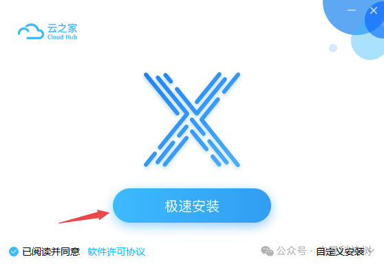 双击下载好的电脑版云之家软件安装包,然后我们可以直接点击【极速安装】按钮,进行快速的一键软件安装。